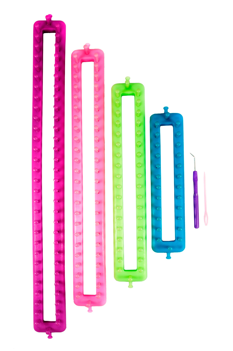 - This is a 4 piece set of extra large, large, medium, small sizes with hook and needle. They are made of sturdy plastic with no sharp edges. X-Large 22 1/2" x 2", large 18" x 2", medium 13" x 2", small 9 1/2" x 2" ; small loom has 26 pegs 1/2" apart, med loom has 38 pegs 1/2" apart, large loom has 50 pegs 1/2" apart, XL loom has 62 pegs 1/2" apart. There is one pattern included with the instructions, check Pinterest for many other ideas.